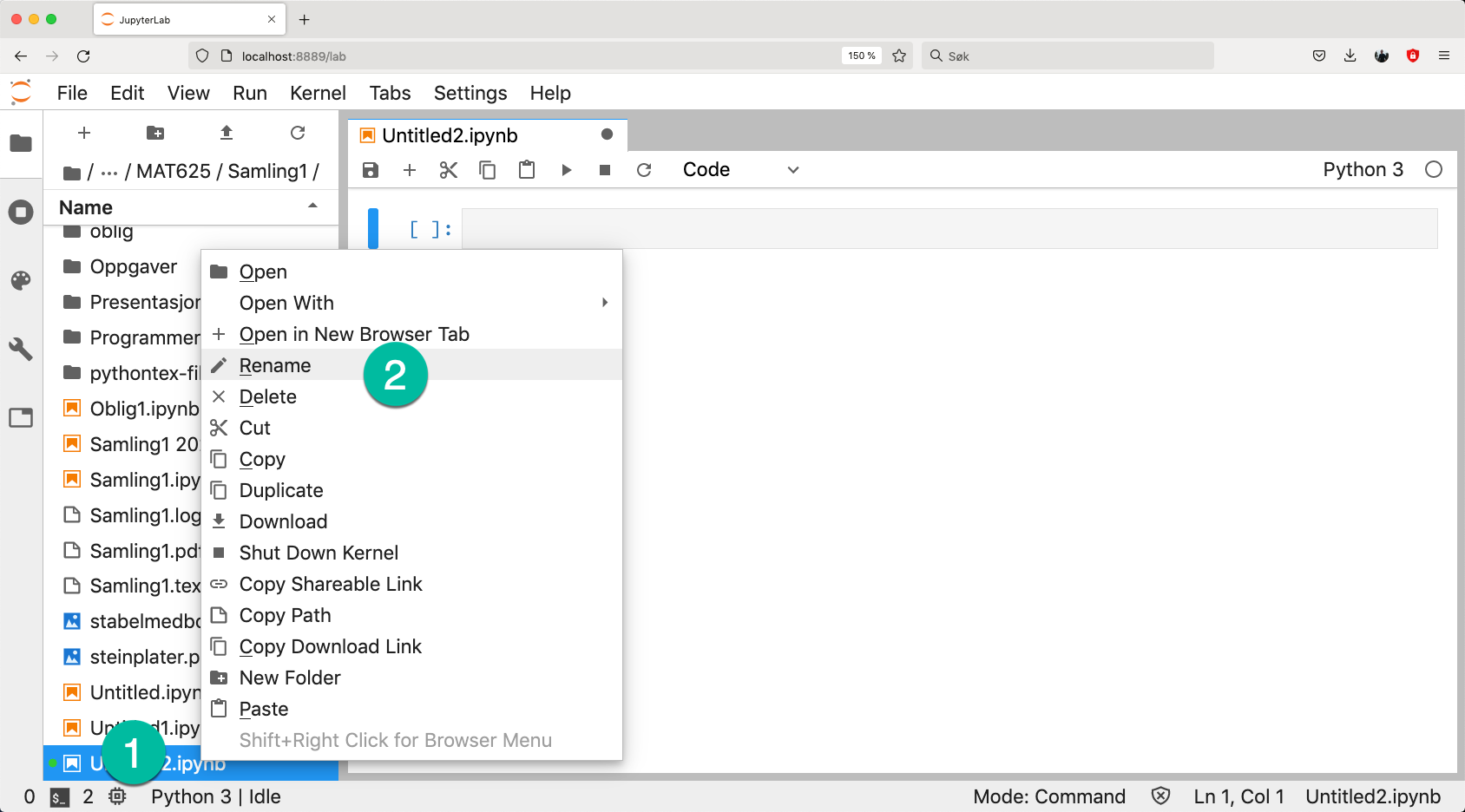 Her har vi høyre-klikket på filnavnet i mappestrukturen til venstre for å kunne gi filen et passelig navn (2).