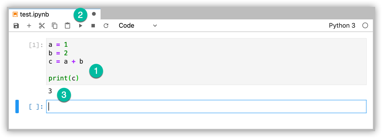 Du klikker på play-knappen (2) for å kjøre programmet i den cellen du står i (1). Resultatet kommer da like nedenfor cellen (3).