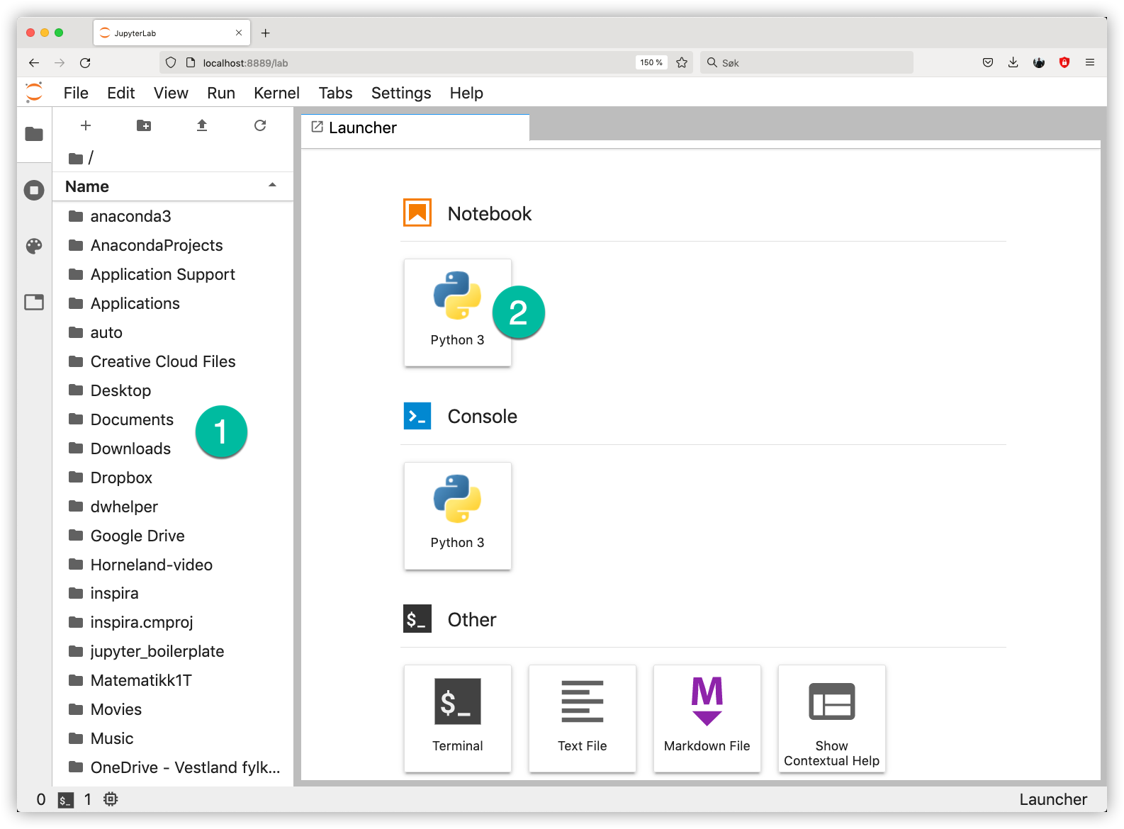 Det fins flere alternativer å velge mellom når du skal installere og programmere i Python. I en undervisningssammenheng er det vår erfaring at JupyterLab fungerer bra. Andre ønsker å bruke Spyder, Thony eller Mu.