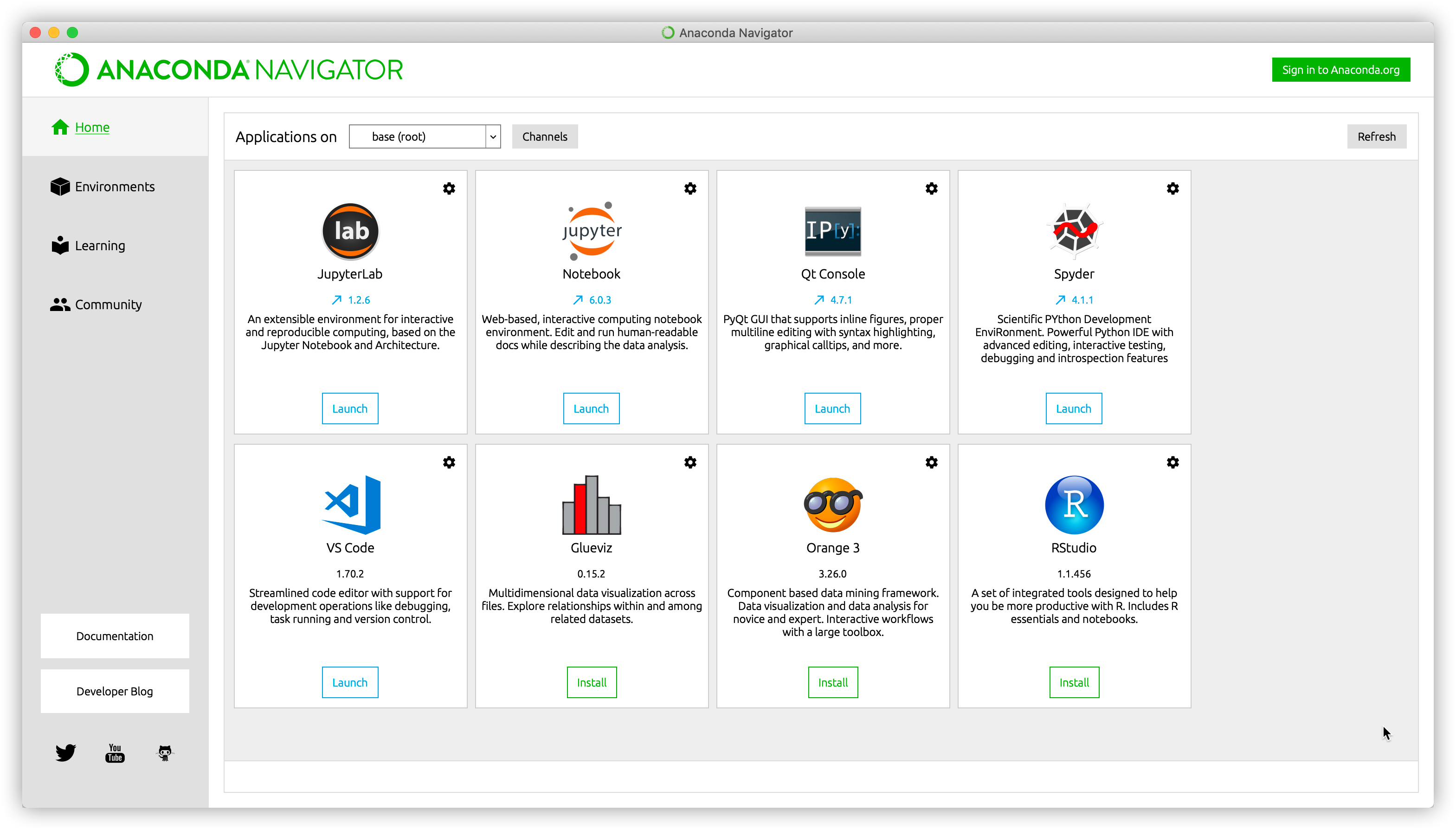 Når du har installert Anaconda, kan du åpne Anaconda Navigator. Her får du oversikt over de ulike programmerene som er installert. Det er for eksempel standart at JupyterLab er med i Anaconda.
